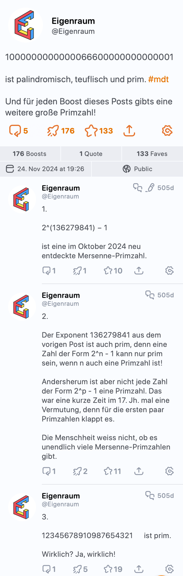 Mathematik im Fediverse beschränkt sich aber nicht auf Mathstodon. Das DFG-Schwerpunktprogramm Combinatorial Synergies (SPP 2458) nutzt Pixelfed, den föderierten Bilder-Dienst, um auf seinem Account @CombSynPeople@pixelfed.de die Menschen hinter der Forschung vorzustellen. Die Fachschaft Mathematik in Magdeburg (@faramath@mastodon.social), die Fachschaft Mathe/Info am KIT (@fsmikit@mastodon.social) und das Mathematische Institut in Göttingen (@migoettingen@academiccloud.social) sind auch auf Mastodon aktiv. Der Eigenraum-Podcast, ein Mathematik-Podcast vom Autor dieses Artikels, nutzt Mastodon für eigenständige Mathe-Posts und Community-Interaktion (@eigenraum@podcasts.social). Über das Netzwerk entstehen diverse Kontakte. Es gibt z.B. auch regelmäßig Rückmeldungen von Lehrkräften, die den Podcast im Unterricht einsetzen. Für mathematische Videoinhalte betreibt der Autor dieses Artikels unter tube.mathe.social eine eigene PeerTube-Instanz.mathe.social würde der Autor im Übrigen der DMV sehr gerne für einen Fediverse-Auftritt zur Verfügung stellen!